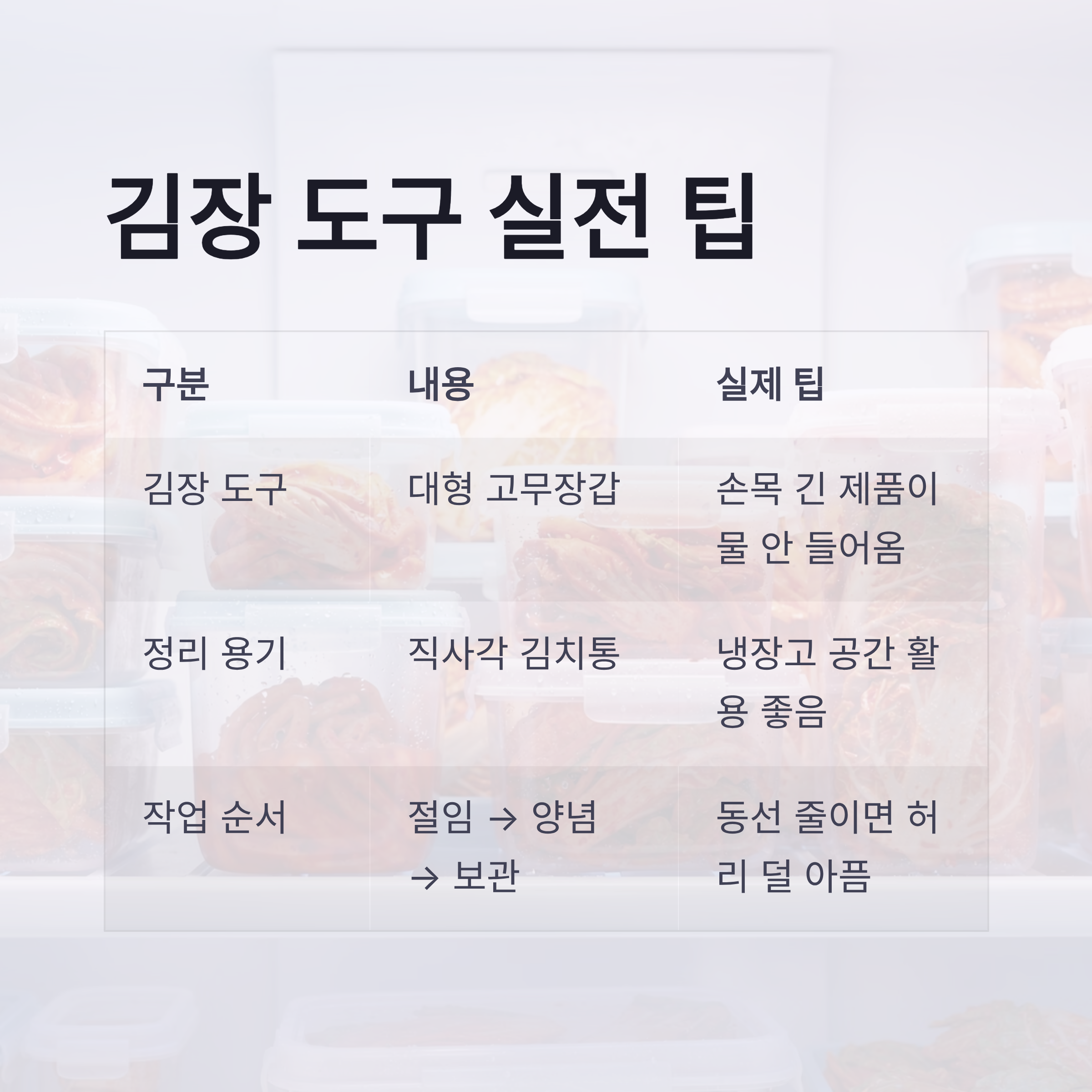 | 작업 순서 | 절임 → 양념 → 보관 | 동선 줄이면 허리 덜 아픔 |