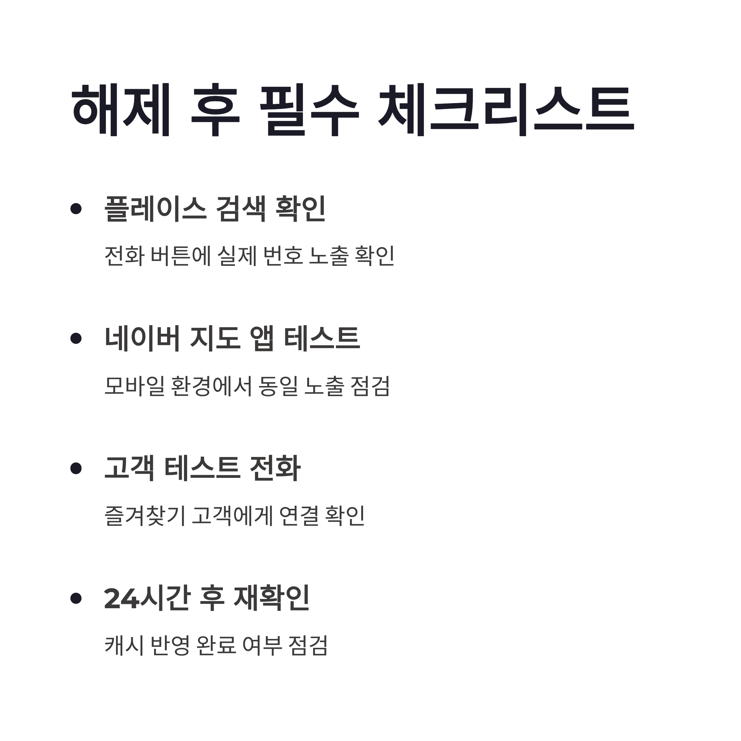 * 플레이스 검색 → 전화 버튼 실제 번호인지 확인 * 네이버 지도 앱에서도 동일하게 노출되는지 체크 * 저장된 즐겨찾기 고객에게 테스트 전화 * 24시간 후 다시 한번 확인 (반영 지연 대비)