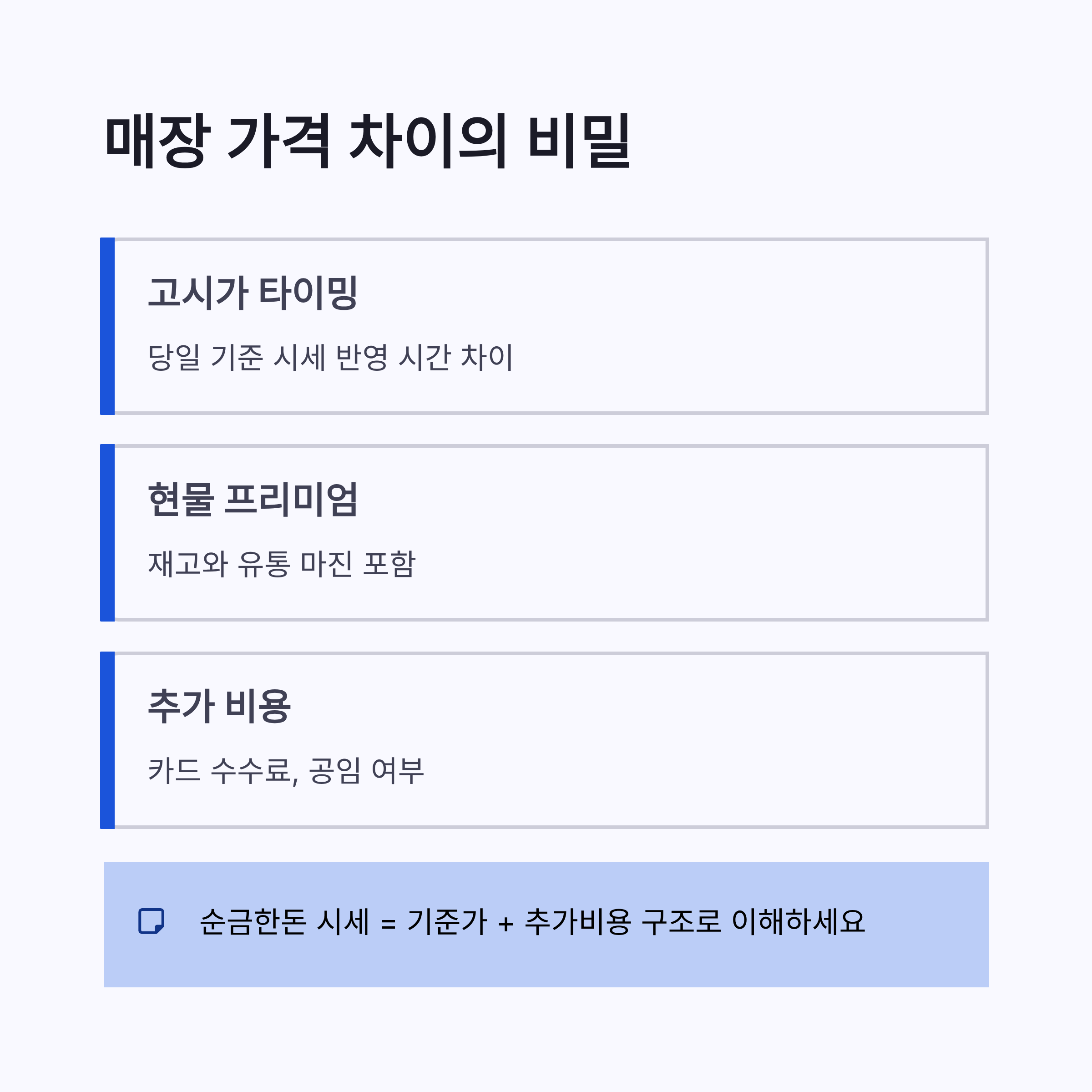 | 순금(24K) | 약 99.9% | 약 3.75g에 가깝게 | 부가 프리미엄/브랜드 마진 |