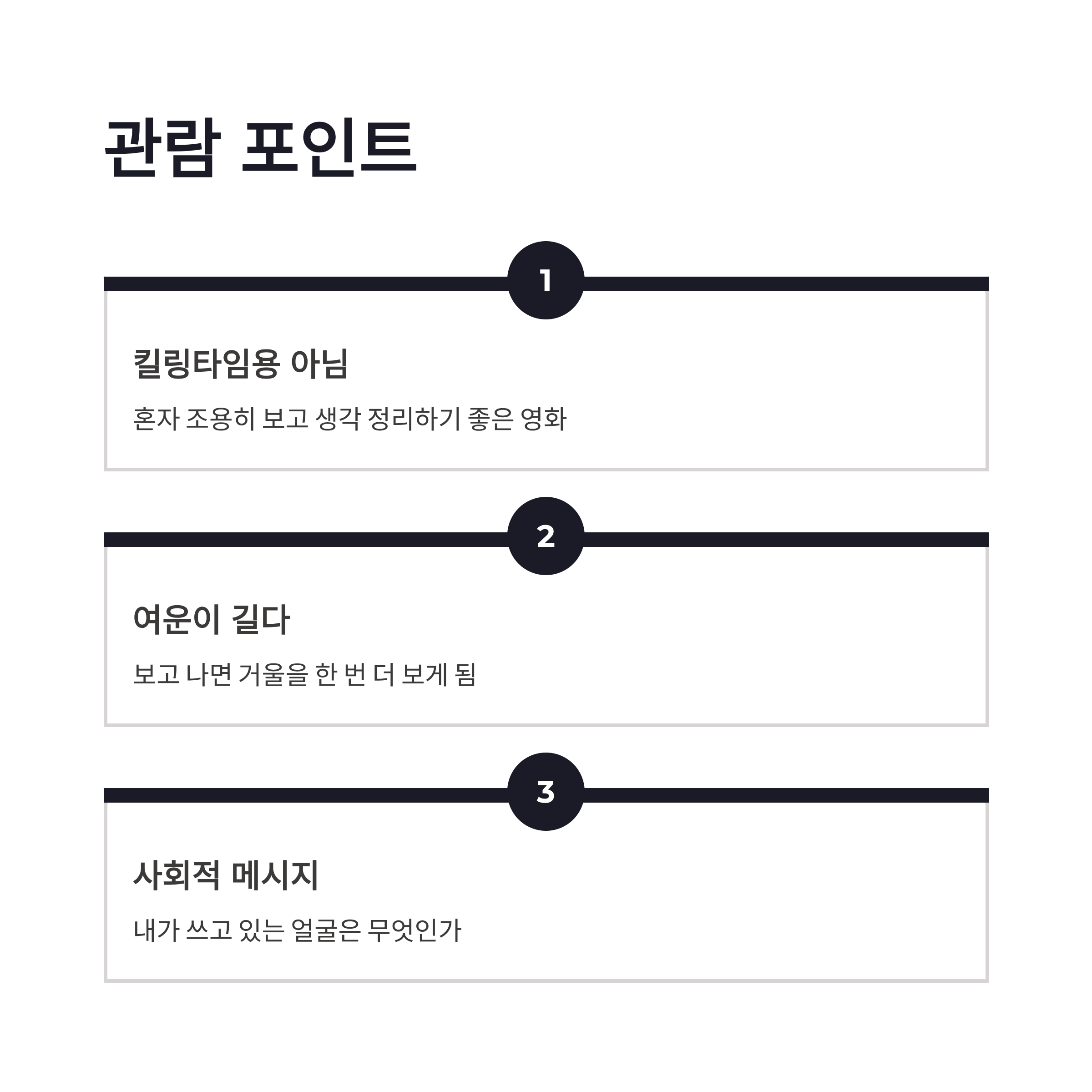 정리하자면 영화 얼굴 정보는 화려하진 않지만 묵직해요. 보고 나면 괜히 거울 한 번 더 보게 되고, 내가 사회에서 쓰고 있는 얼굴은 뭘까 생각하게 되더라구요. 킬링타임용은 아니고, 혼자 조용히 보고 생각 정리하기 좋은 영화였어요. 이런 류 좋아하신다면 꽤 만족하실 듯! 여러분은 지금 어떤 얼굴로 살아가고 있는 것 같나요? 괜히 궁금해지네요.