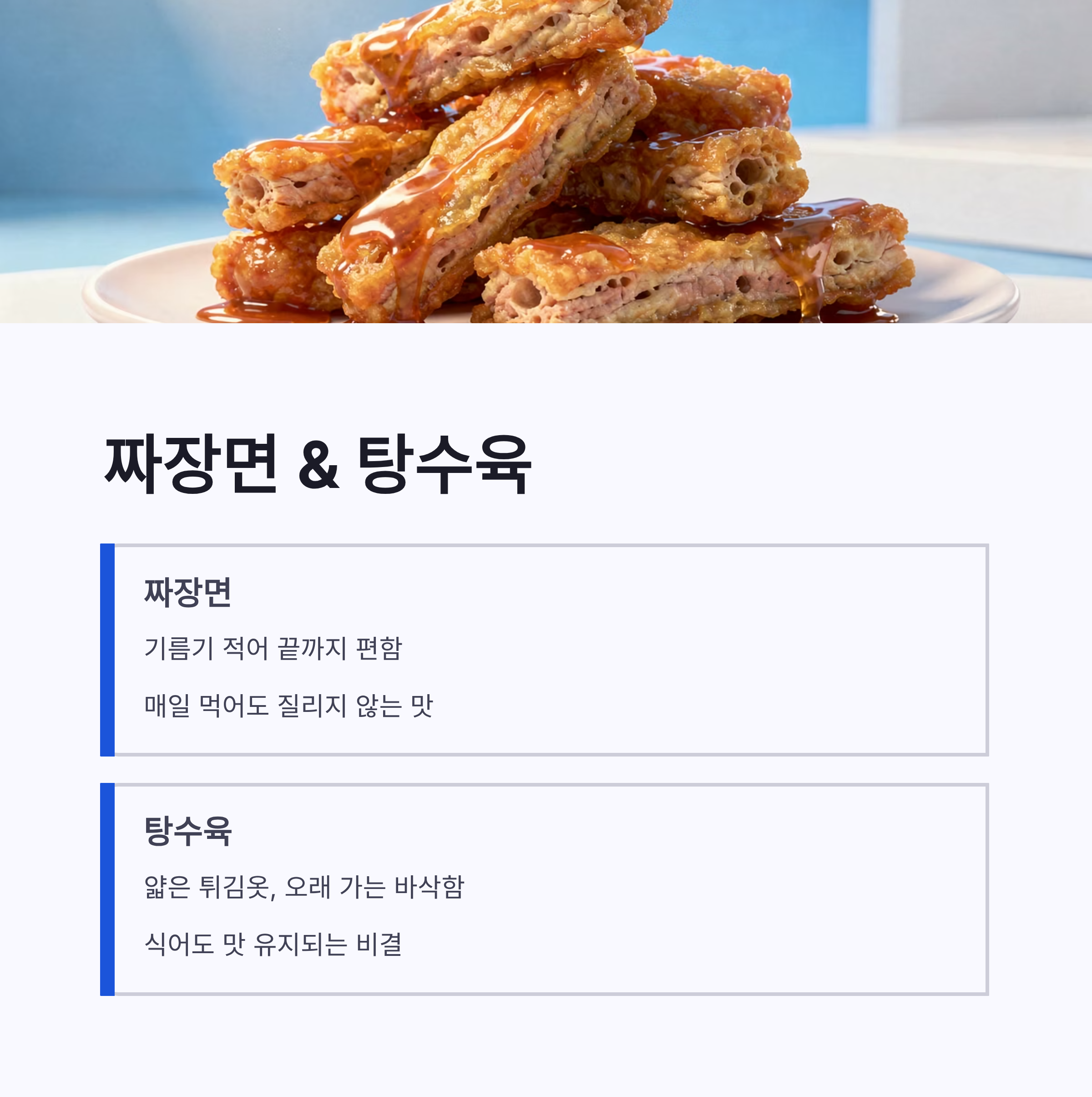 | 탕수육 | 얇은 튀김옷 | 식어도 바삭 |