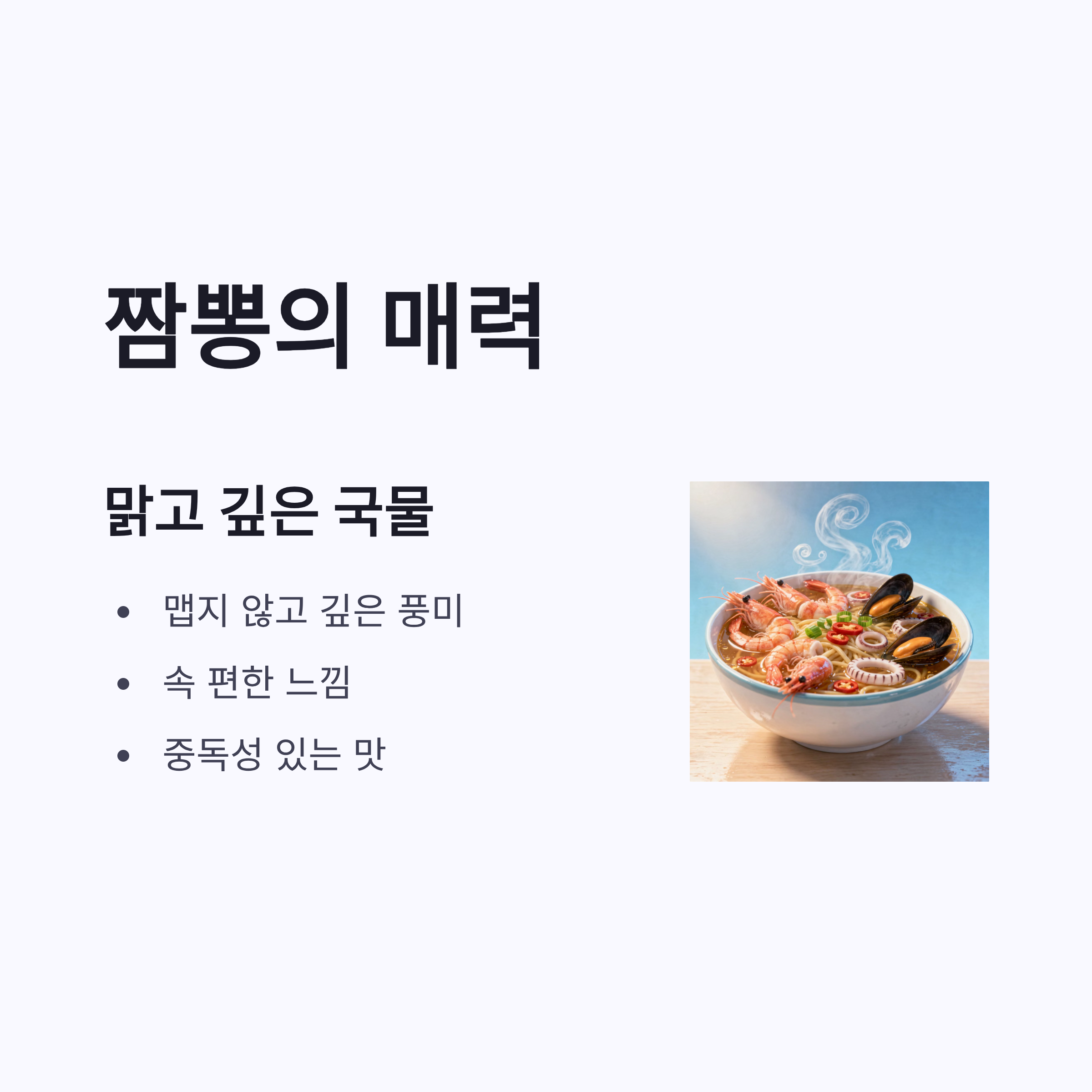 | 짬뽕 | 맑고 깊은 국물 | 속 편함, 중독성 있음 |