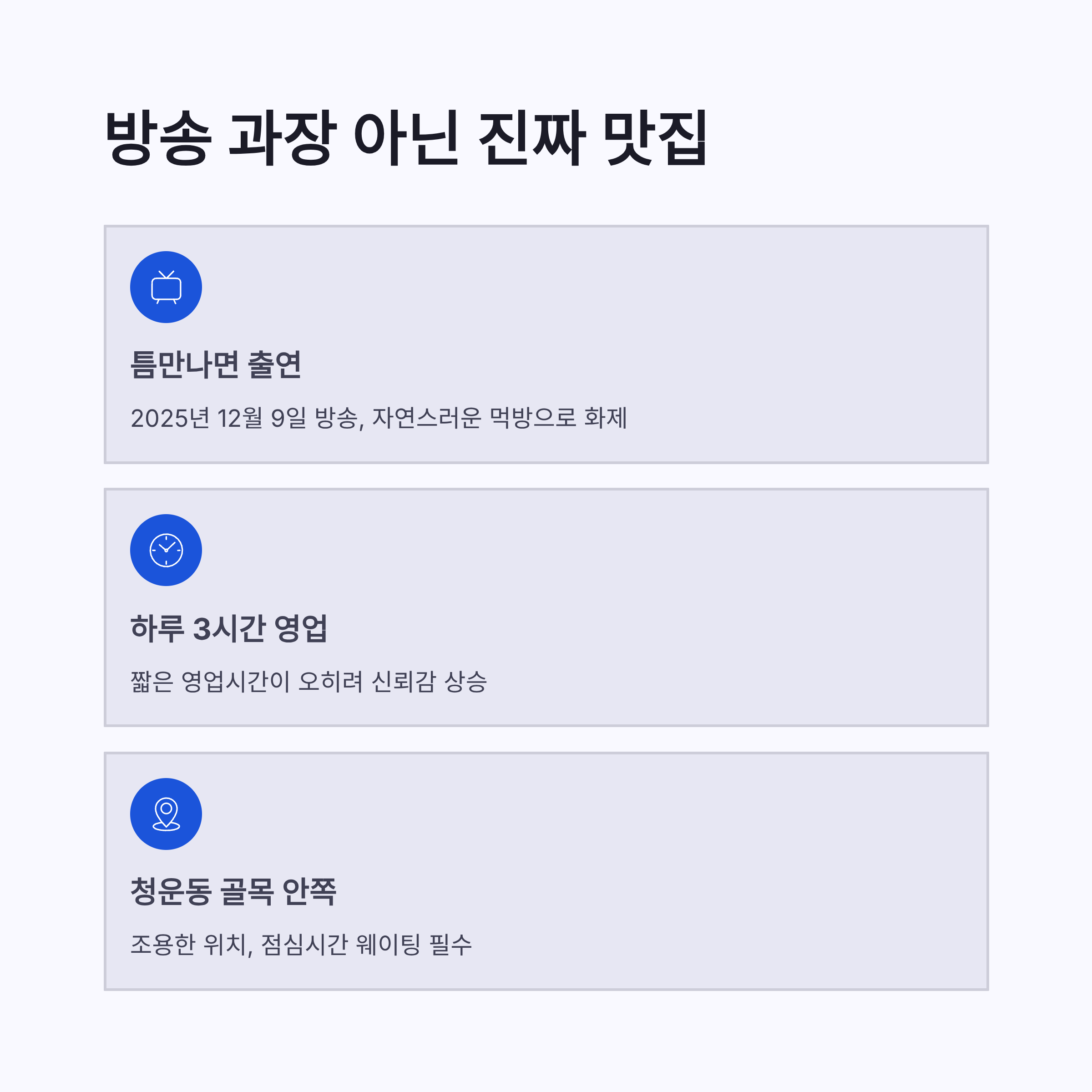 솔직히 방송 나오면 반은 과장 아니냐 싶잖아요? 근데 청운동 중국집 ‘중국’은 좀 달랐어요. 2025년 12월 9일 방송된 *틈만나면 시즌4 36회*에서 이제훈, 표예진이 자연스럽게 먹는 장면 딱 하나로 분위기 끝났구요. 화려한 설명도 없고, “여기 자주 온다”는 말 한마디가 다였는데… 그게 오히려 신뢰감이 있더라구요. 게다가 하루 단 3시간 영업이라는 조건. 아니 이건 일부러 안 알려고 해도 궁금해지는 구조잖아요 ㅎㅎ 청운동 골목 안쪽에 조용히 있는데, 점심시간 되면 웨이팅이 생기는 이유가 딱 느껴졌습니다. 청운동 중국집 중에서도 이런 분위기 흔치 않아요, 진짜로요.